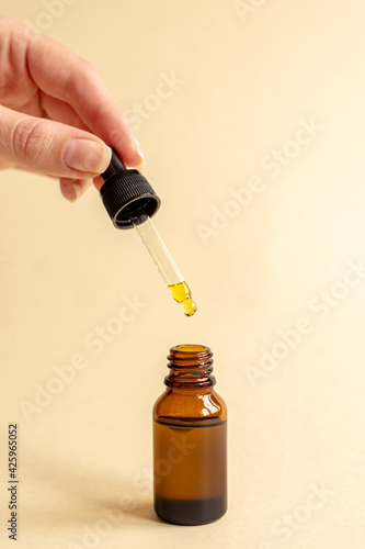 female hand with Dropper of essential oil, aromatherapy essence, beuty serum or medicinal liquid on beige background. Unbranded bottles for your design.