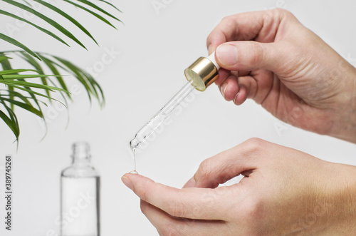 Female hands dropping serum collagen moisturizer. Protector skin facial treatment essence oil, Vitamin C. Beauty health care cosmetics concept.