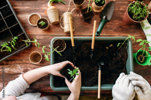 Female hands planting seedlings at home holding garden tools. Hands of girls and little sprouts. Gardening. Flat lay