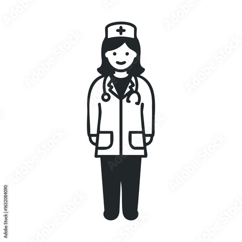 female, health care, professional, icon, uniform, medicals, doctor, nurse, stethoscope, cartoon, illustration, symbol, occupation, job, black, white, graphic, attire, medicine, health, men at work, care, hospital, design, avatar, outline, vignetting, simple
