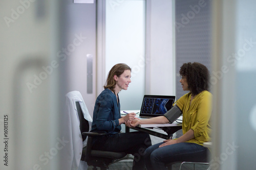 doctor, general, practitioner, patient, blood, pressure, test, measuring, exam, explaining, listening, medicals, health, health care, surgery, clinic, center, office, practice, occupation, medicine, adviser, hospital, working, orthopedist, clinician, specialist, laptop, x-ray, caucasian, adult, 40s, 30s, mid, multiracial, african american, black, mixed race, female, woman, only
