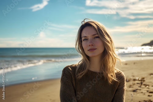 Female Model on the Beach with Blue Sky and Few Clouds in the Background