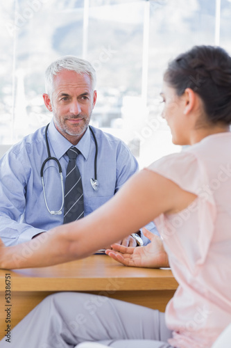 20s, young adult, woman, female, caucasian, 50s, mature adult, man, male, indoor, attractive, pretty, brunette, dark hair, light hair, grey hair, doctor, practitioner, stethoscope, medicals, specialist, health care, exam, disease, sick, patient, health, examining, consulting, disease, medical office, office, clinic, hospital, desk, working, sitting, talking, speaking, discussing, explaining, listening, happy, smiling, cheerful