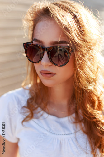 Female portrait of a beautiful fashion young redhead girl with stylish sunglasses in a trendy white T-shirt at sunset