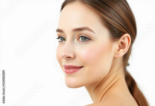 depth, space, focused, calm, simple, gaze, pure, background, softly, human, photorealistic, realism, female, clean, shallow, distance, gentle, negative, feature, expression, overlay, field, eye, white, face, portrait, smile, soft, composition, facial, subtile, people, profile, isolated