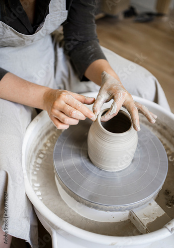 female, potter, molding, shape, pottery, wheel, workshop, 1, people, adult, business, woman, art, expertise, craft, casual attire, midsection, sitting, motion, working, ceramic, creation, creativity, workplace, producing, molding, handcraft, young, caucasian, skill, occupation, job, apron, clay, craftsman, preparation