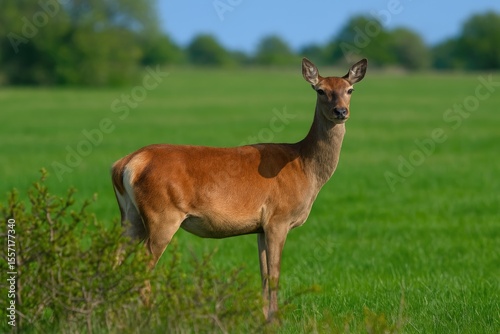 travel, nature, spring, grass, animal, green, blue, red, park, game, environment, adventure, eye, cervid, mammal, season, wildlife, fauna, wilderness, fur, springtime, nose, doe, ear, hunter, hind, countryside, bush, brown, bush, female, majestic, stare, wild