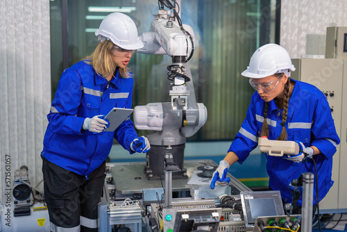 Female robotic factory workers use tablet pc quality checking Circuit Boards after assembly