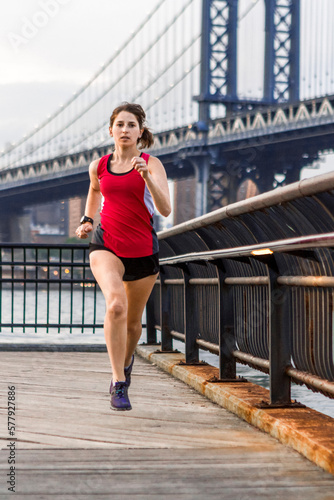 Female runner on waterfront in Brooklyn with Manhattan Bridge