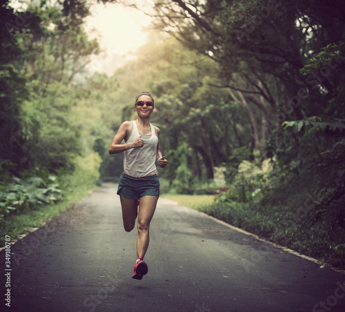 Female runner running at summer park trail . Healthy fitness woman jogging outdoors.