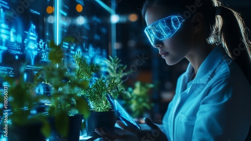 science, technology, woman, scientist, laboratory, research, plant, future, innovation, datum, analysis, digital, screen, futuristic, genetic, biotechnology, agriculture, botany, growth, experiment, discovery, development, progress, engineering, medicine, health care, ecology, environment, sustainable, global, interface, hologram, goggles, device, tablet, modern, professional, focused, concentrated, working, studying, learning, explore, examine, observation
