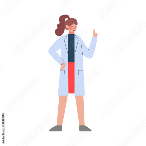 Female Scientist or Doctor Character, Woman in White Coat Giving Advice with Raised Index Finger Flat Style Vector Illustration