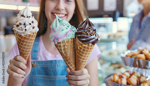 Female seller holding two yummy ice creams in waffle cone at the shop, close-up