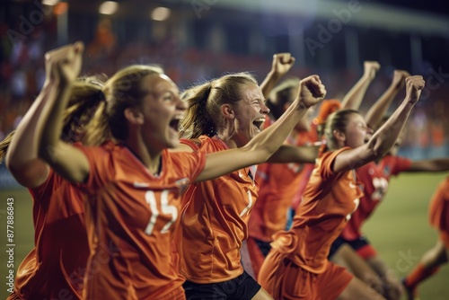 soccer, player, team, goal, celebration, field, stadium, light, night, sport, game, competition, victory, joy, excitement, action, dynamic, professional, athlete, teamwork, winning, sportsmanship, orange, female, energy, enthusiasm, cheering, success, achievement, stock, commercial