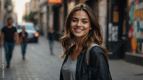 female, street, artist, tied-up, urban, background, woman, city, people, fashion, beauty, person, hair, face, model, smiling, smile, 1, outdoors, autumn, lifestyle, casual attire, looking, walking, lady, shopping, jacket, winter