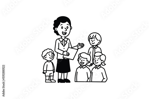teacher, student, classroom, education, teaching, lesson, school, vector, illustration, children, children, woman, female, presentation, explain, learning, group, people, cartoon, character, outline, drawing, design, graphic, clip art, icon, symbol, figure, artwork, art, line art, black-and-white, monochrome, minimalist, simple, silhouette, back to school, elementary school, elementary school, pedagogy, cognition, study, pupil, tutor, explaining