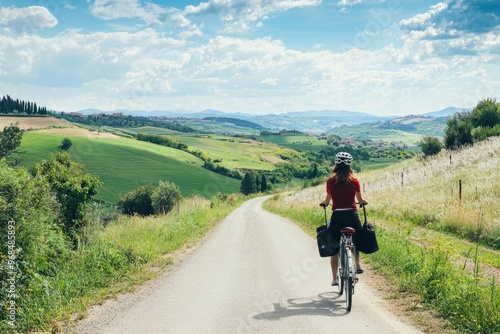 Female tour guide leading a bicycle tour through picturesque countryside. Rolling hills and open fields surround the path