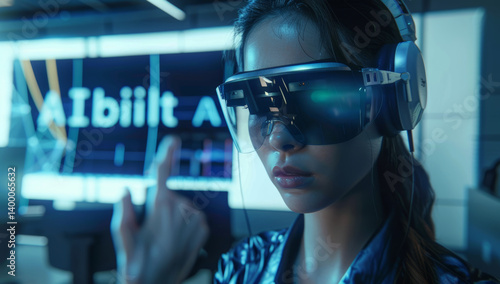 Female woman worker working with virtual reality agent wearing sleek VR goggles headset and a holographic interface, A Futuristic Agency" in a future setting. Artificial intelligence world