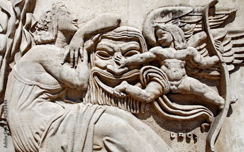 woman, angel, cherub, love, cupid, arched, mother, saint-pierre, sculpture, statue, relief, bas-relief, wall, frontend, ancient, classic, paris, france, museum, art, modern, palace, tokyo, mask, comedy, tragedy, theatre