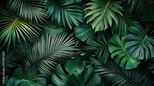 Fern leaves on a dark background in the jungle. Dense dark green fern leaves in the garden. Nature abstract background. Fern at tropical forest. Exotic plant. Beautiful dark green fern leaf texture.