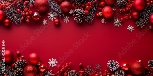 Festive arrangement featuring snowflakes and vibrant decorations against a solid red background, perfect for holiday celebrations and winter festivities