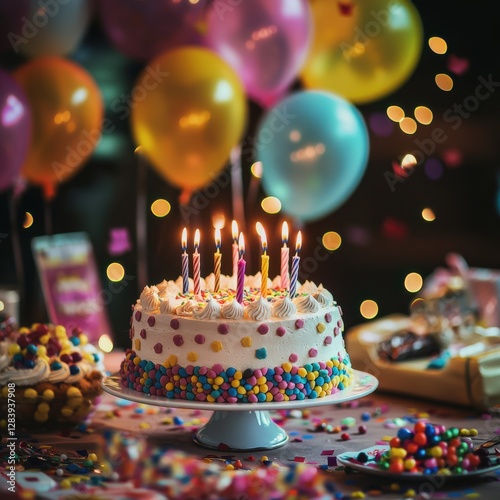 cake, birthday, celebration, dessert, cream, frosting, candle, colourful, sweet, party, balloon, confetti, table, happiness, treat, food, favor, joy, gathering, event, festive, treat, decoration, occasion, atmosphere, delicious, vanilla, sugar, hospitality, cheerful, bakery, pastry, tableware, event, rainbow, joyful, gathering, birthday party