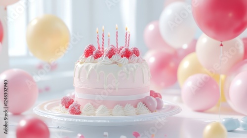 Festive Birthday Cake with Raspberries and Colorful Balloons Decor