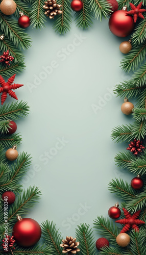 Festive border design featuring lush green pine branches and red ornaments, creating a joyful Christmas atmosphere.