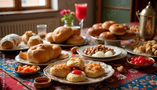 wheat, bread, pastry, festive, food, nut, juice, homemade, traditional, baked goods, cosy, brunch, celebration, holiday, sweet, inviting, natural light, spring, morning, fresh, vibrant, elegant, dining, comfort food, cultural, cheerful, rustic, wholesome, classic, warm, variety, dessert, countryside, feast, stylish, bright