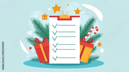 checklist, festive, gift, holiday, decoration, ribbon, present, pine, candy, cane, celebration, season, winter, box, star, planning, organised, christmas, cheerful, green, red, white, wrapping, paper, bow, tradition, occasion, preparation, list, to do, task, completed, joy, merry, branch, background, ornament, design, graphic, illustration