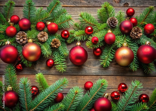 Festive Christmas Background with Red Balls and Fir Branches for Holiday Decor and Seasonal Celebrations