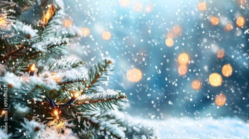 Festive Christmas Background with Snow-Covered Fir Tree and Blurred Lights, Perfect for Winter Landscape, New Year Celebration, Snowy Nature Wallpaper, Christmas Card Template with Space for Text