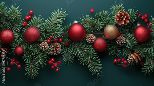 Festive Christmas banner featuring lush green pine branches, vibrant red baubles, pine cones, and berries on a dark background.