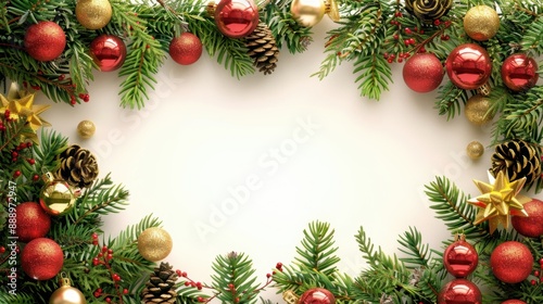 Festive Christmas border with pine branches, red and gold ornaments, pine cones, and berries on a white background. Concept of holiday decoration and celebration.