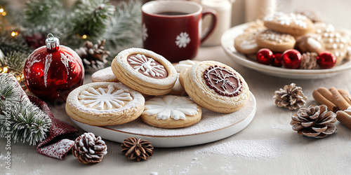 cookie, christmas, festive, dessert, plate, holiday, sweet, decoration, hot drink, winter, treat, baking, celebration, cosy, traditional, hand-made, icing, design, favor, atmosphere, epicure, aroma, delicious, classic, sugar, confection, enjoyment, gathering, cheerful, decorative, pine cone, red, seasonal, warmth, indulgence, hospitality, home, craft, joyful, tasting