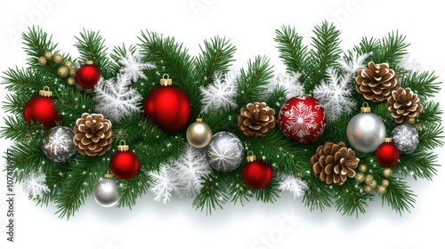 Festive Christmas Decor with Ornaments, Pinecones, and Snowflakes