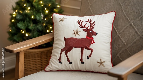 Festive Christmas decorated pillow with a reindeer design resting on a chair