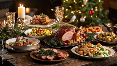 christmas, feast, dinner, table, turkey, ham, roast, side, dish, vegetable, potato, gravy, greener, salad, fruit, plate, bowl, glassware, candle, tree, decoration, holiday, abundance, delicious, family, gathering, celebration, festive, meal, epicure, carving, aroma, warmth, tradition, seasonal, elegant, rustic, wood, dinnerware, rich, deliciously, appetising, platter, food