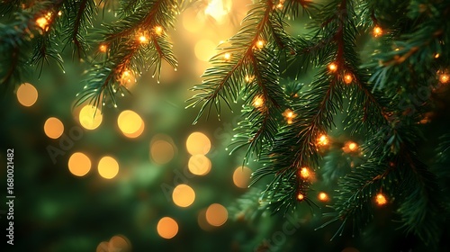 christmas, holiday, tree, fir, tree branch, light, bokeh, background, festive, season, decoration, ornament, sparkle, glowing, bright, winter, nature, evergreen, spruce, coniferous, closeup, macro, detail, warm, gold, yellow, green, abstract, blurry, soft, dreamy, celebration, greeting, card, invitation, new year, december, joy, magic, atmosphere, calmness, natural, seasonal, christmas, copy space
