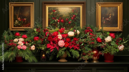 christmas, holiday, festive, decoration, floral arrangement, flower, evergreen, christmas flower, red, pink, white, mantel, fireplace, garland, greenery, berry, vase, ornament, winter, home decor, interior design, traditional, elegant, seasonal, celebration, beautiful, colourful, vibrant, natural, rustic, classic, cosy, warm, inviting, joyful, happiness, cheer, merry, christmas spirit, christmas eve, christmas