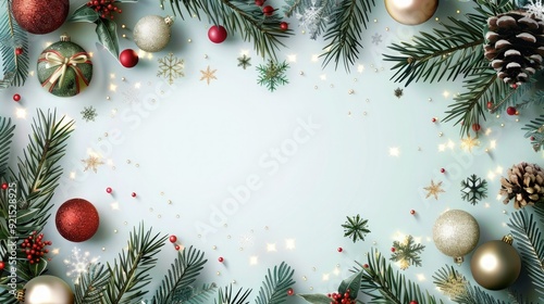 Festive Christmas frame with pine branches, ornaments, and snowflakes set against a light background, perfect for holiday greetings.