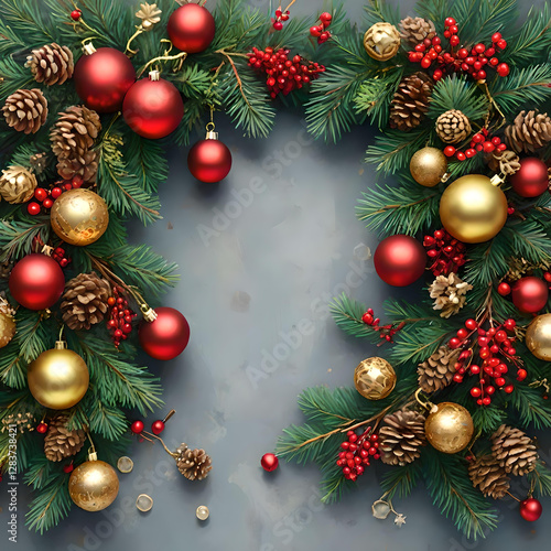 Festive Christmas frame with red and gold ornaments, pinecones, holly berries, and evergreen branches on a dark textured background