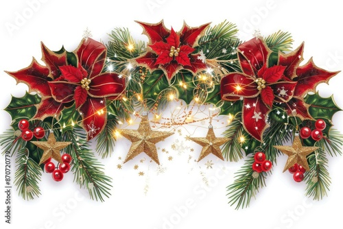 Festive Christmas garland with poinsettias, pine branches, and gold stars, perfect for holiday decor and celebration.