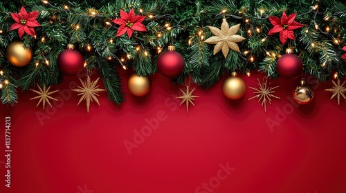 Festive Christmas Garland with Red and Gold Ornaments on Red Background