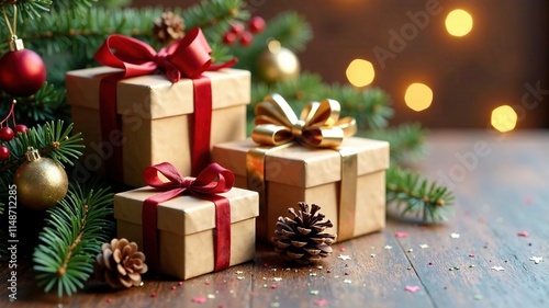 christmas, gift box, decoration, christmas tree, present, decor, banner, depth of field, lighting, photorealistic, high-quality, pine cone, ribbon, sparkle, elegant, luxury, holiday season, celebratory, winter scene, christmas spirit, gift wrapping, holiday spirit, warm, christmas decoration, christmas gift