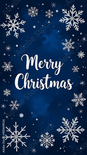festive Christmas greeting card, white silver snowflakes and white cursive lettering that reads Merry Christmas, dark blue background.seasonal website background, personalized e-cards concept.