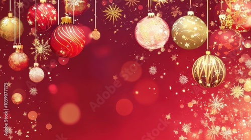 Festive Christmas Ornaments and Snowflakes on Vibrant Red Background with Golden Highlights