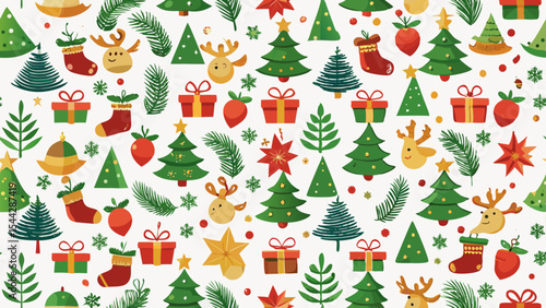 christmas, holiday, festive, pattern, seamless, background, tree, gift, present, snowflake, santa, reindeer, bell, ornament, bauble, star, gingerbread, candy, sock, snowman, sleigh, light, chaplet, pine, decoration, cosy, red, green, white, gold, ribbon, party, winter, snow, cute, cartoon, traditional, celebration, cheerful, joy, merry, wrapping, star, twinkle, holly, vintage, fabric, textile, wallpaper