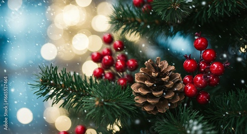 Festive Christmas scene: evergreen branch adorned with red berries and a pine cone, bathed in soft bokeh lights and snowfall.