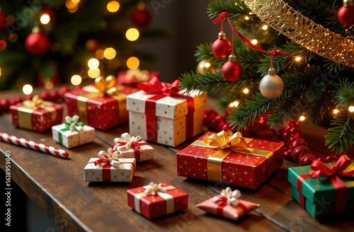 christmas, gift, tree, festive, decoration, holiday, present, celebration, wrapped, ornament, pine, light, ribbon, bow, candy, cane, wooden, table, gold, red, green, seasonal, winter, joy, tradition, cheerful, sparkling, indoor, setting, cosy, warm, shiny, december, party, family, gathering, nostalgia, anticipation, christmas eve, surprise, happy, atmosphere, box, magic, cheer, homespun